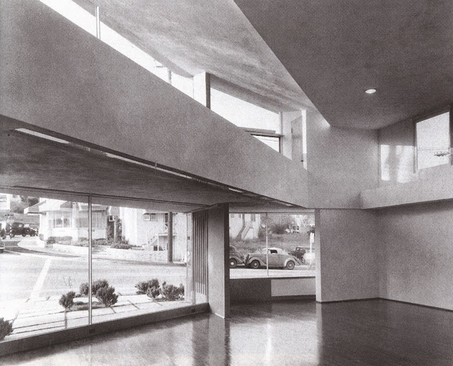 'The sloped and multifaceted gesture is in reality a mezzanine to the main corner store. It originally was a crystalline form filled with glass that glimmered with the afternoon sun and washed the selling floor below with light. Morning sun came in through another set of clerestory windows in the back. (…) a network of stretched diagonals, intersecting lines and sloped forms into planes of white and glass. The unit floats on its steeply sloped site, held up by an L-shaped stucco sill or underline that was a device Schindler often used to transform his flat facades into Cubist compositions. A vertical plane sticking up over the facade on Holloway grounds this geometric flourish and acts as a counterpoint to another set of horizontal lines that become lintels for the rest of the storefronts. The active glass boxes of the units push up and out to display their wares, decomposing the simple stucco forms above them. It makes you feel as if the building is a gift box whose wares are exploding out from the bottom."