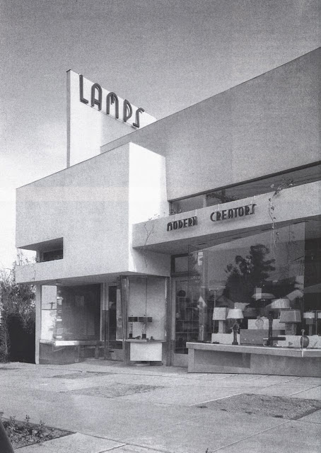 The building is a geometric clamshell with a staggering view of Sunset Boulevard. The row of four shop units originally was designed for A. Garland in 1936 and finished in stages between 1937 and 1946.